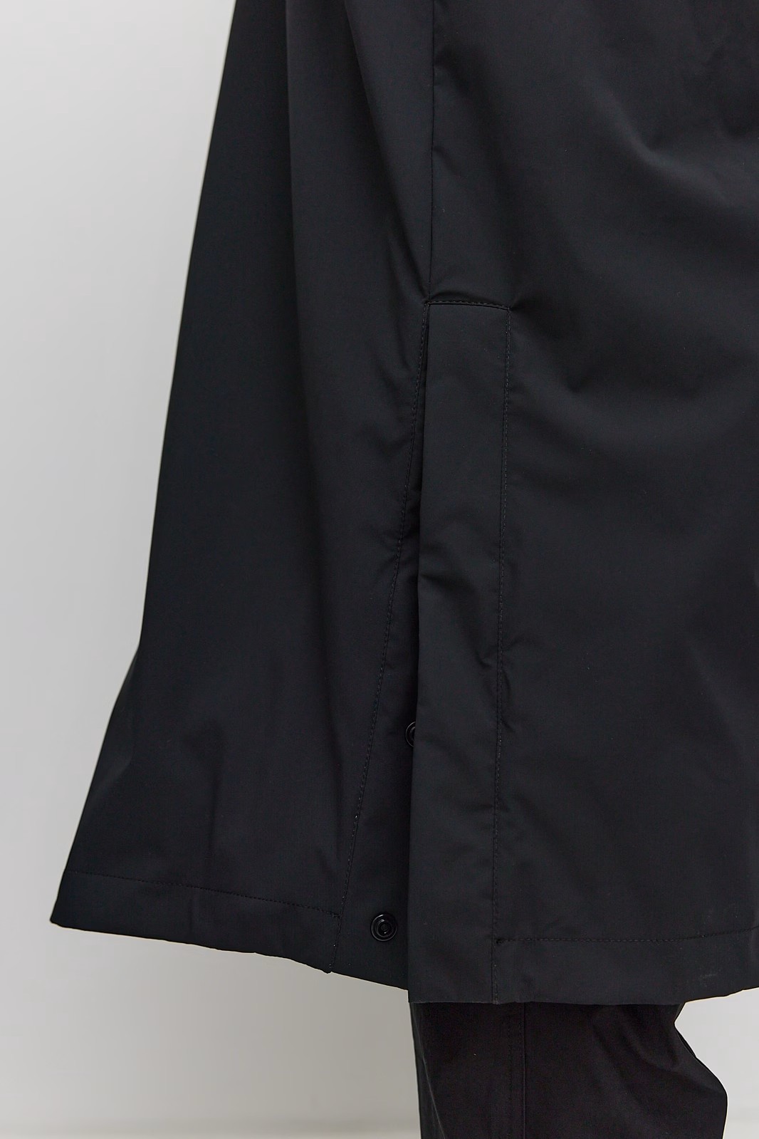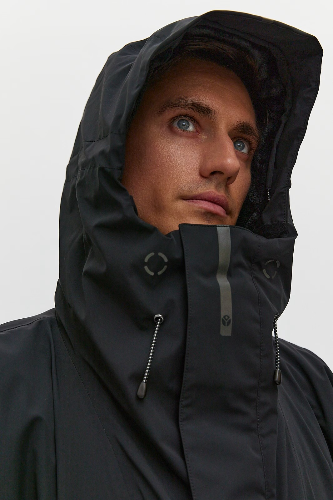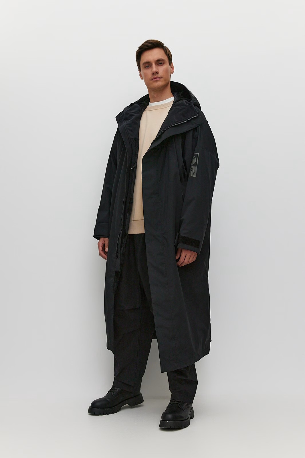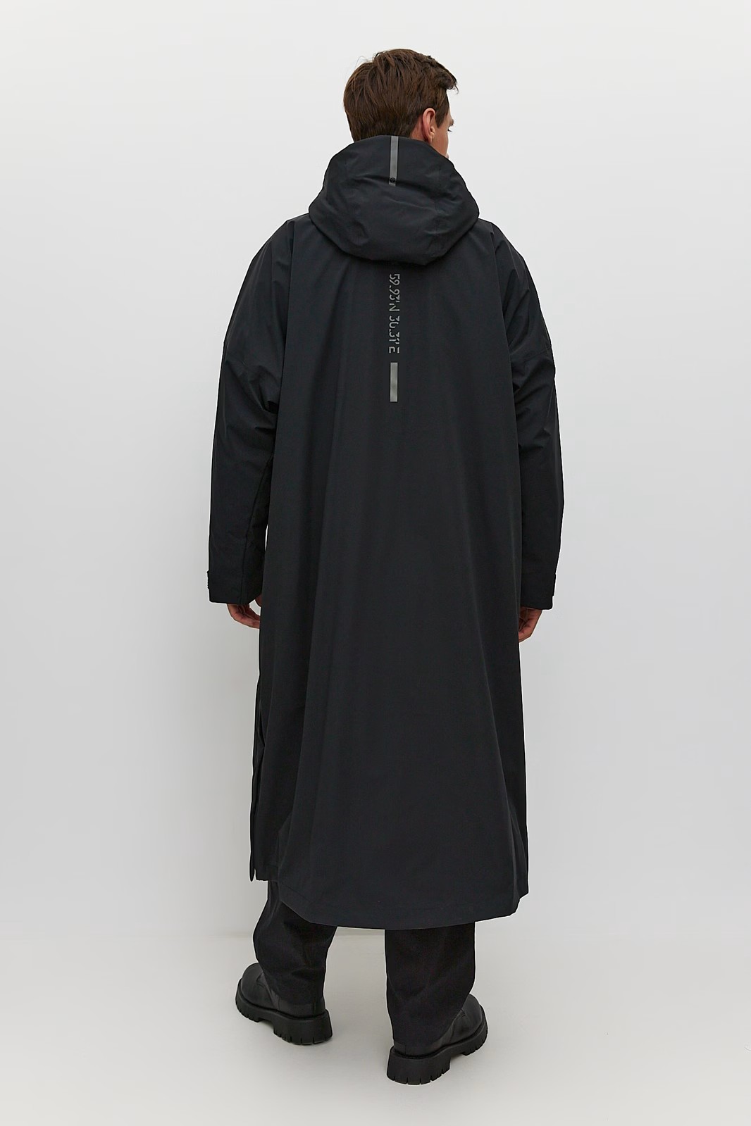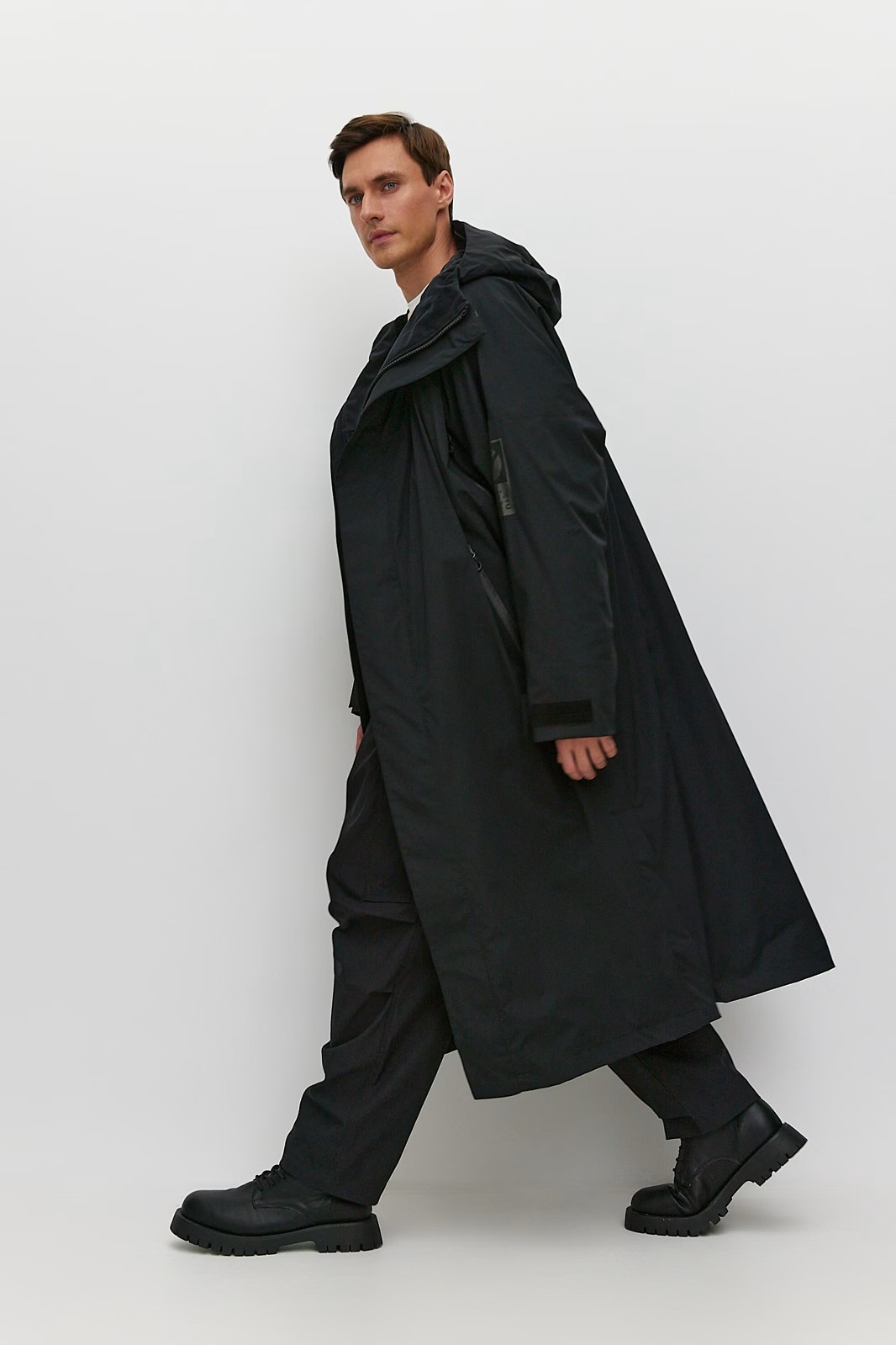 Плащ оснащен регулируемыми манжетами и высоким объемным капюшоном для дополнительной защиты от ветра и дождя.