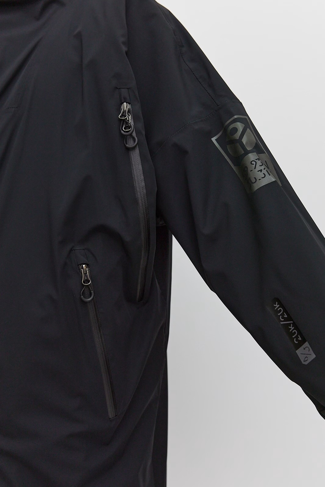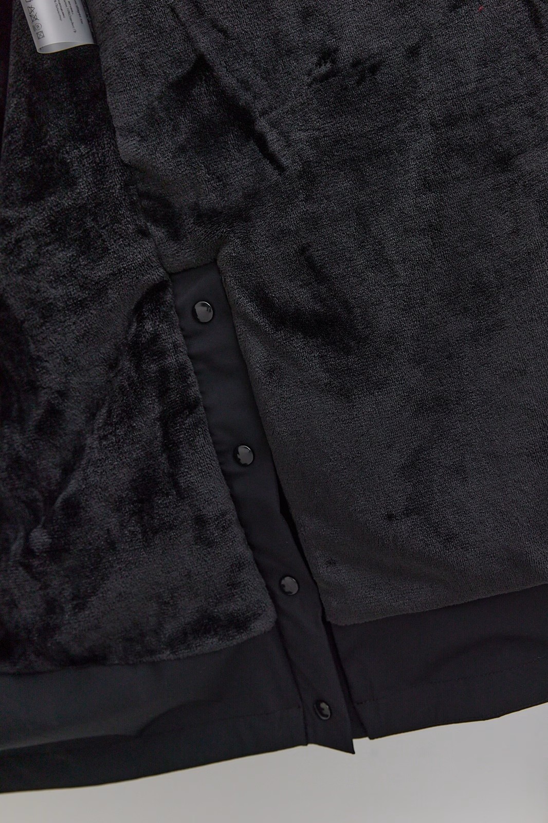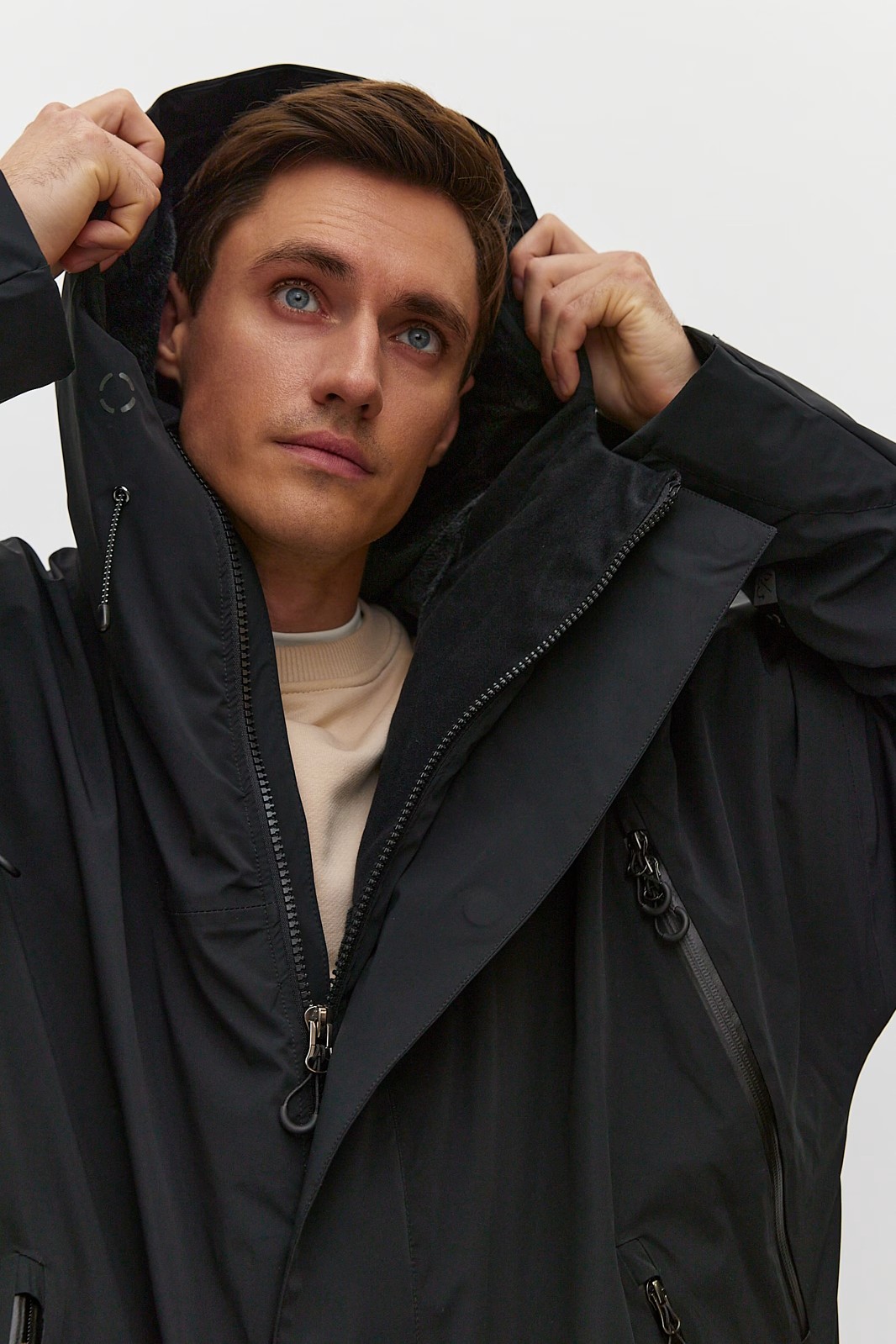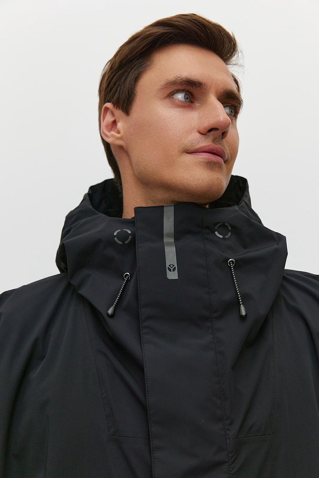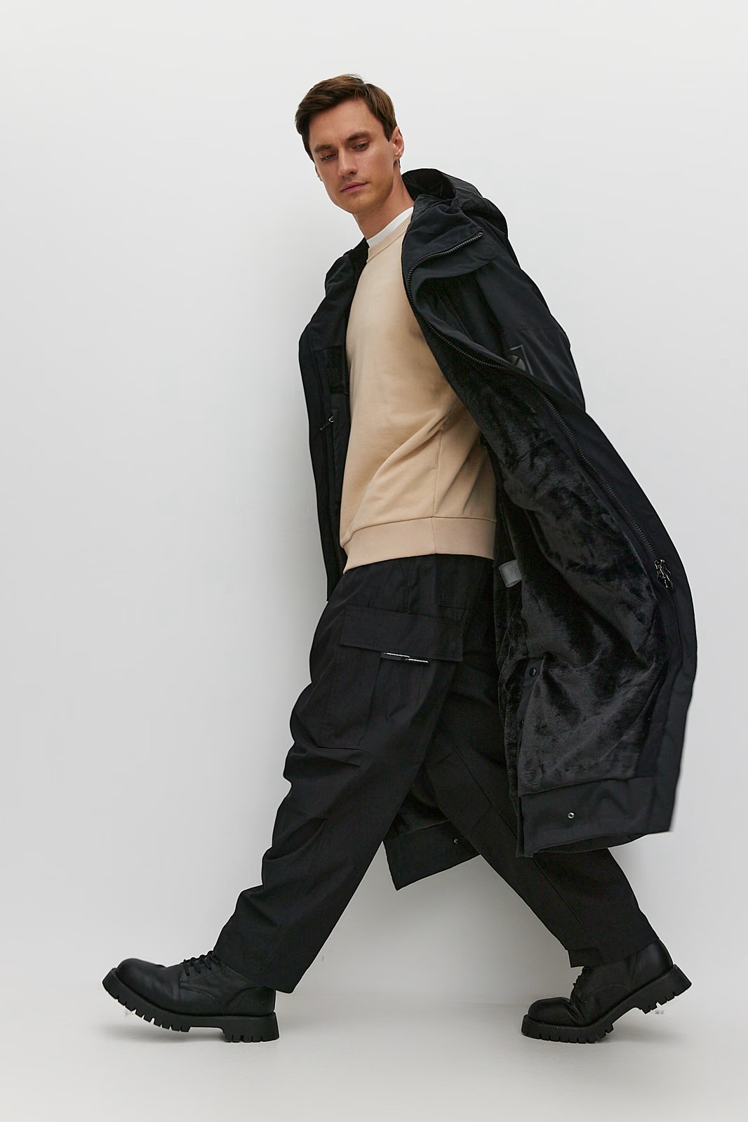 Плащ оснащен регулируемыми манжетами и высоким объемным капюшоном для дополнительной защиты от ветра и дождя.