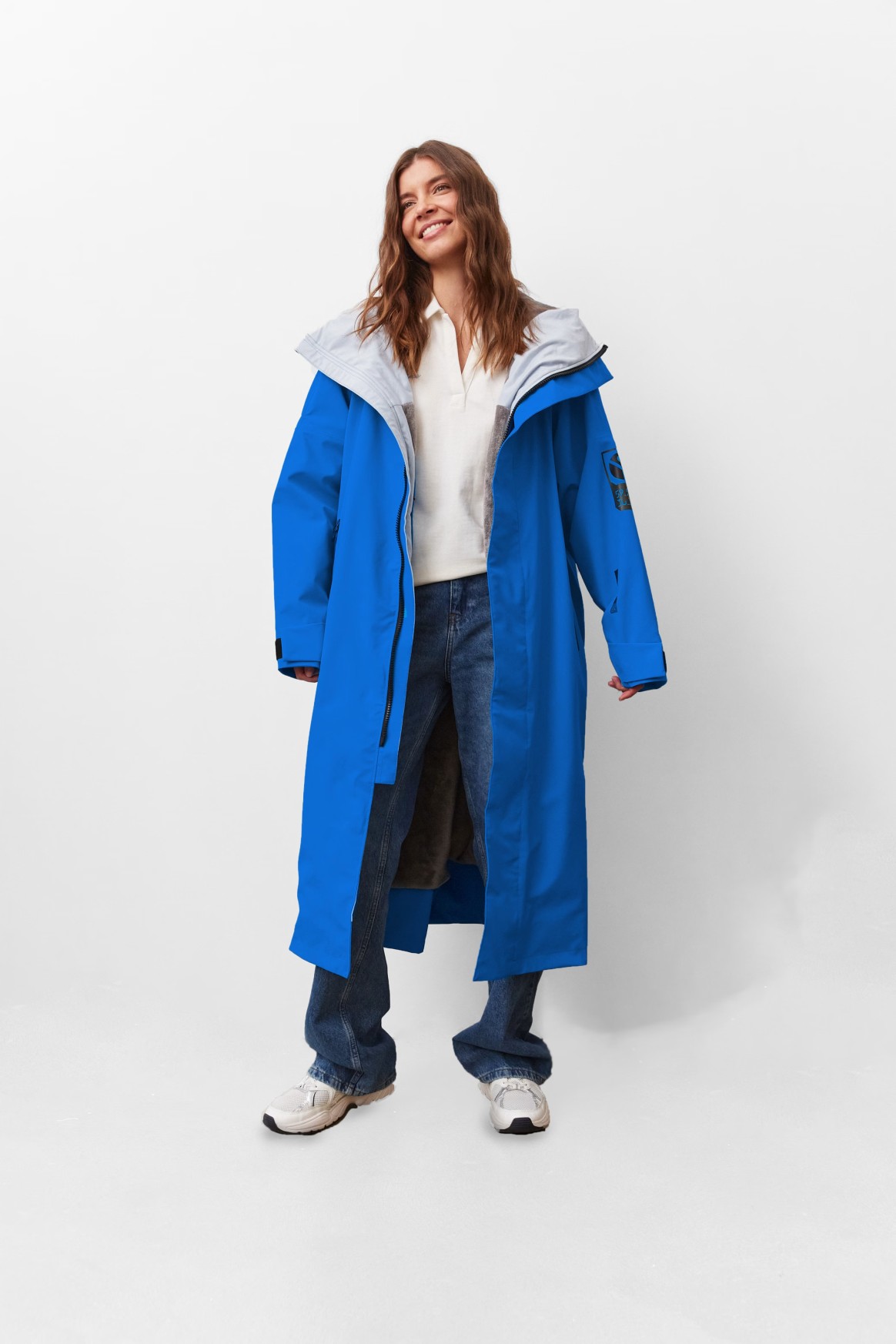 Плащ оснащен регулируемыми манжетами и высоким объемным капюшоном для дополнительной защиты от ветра и дождя.
