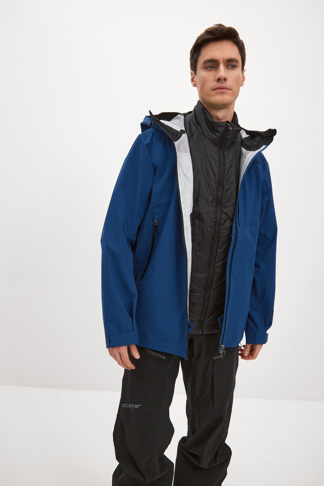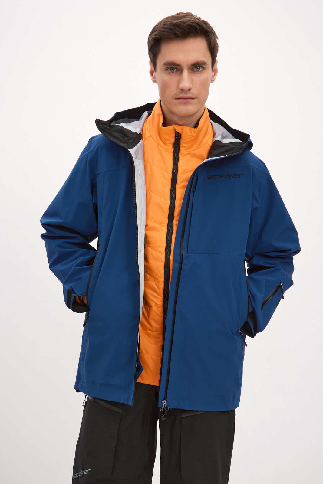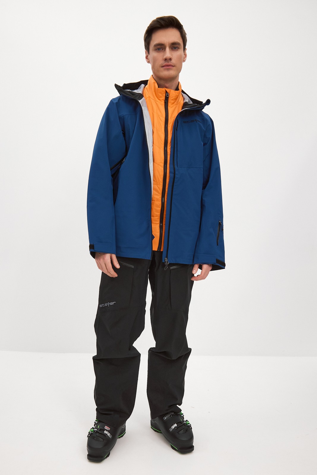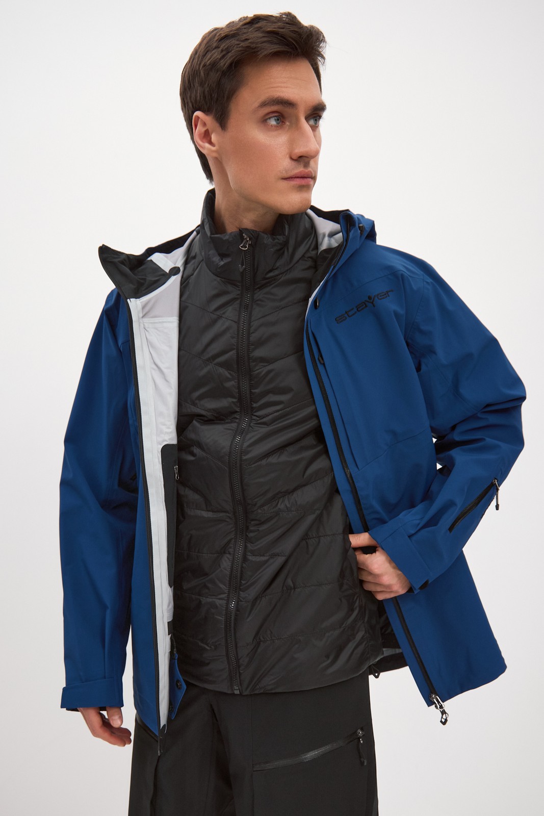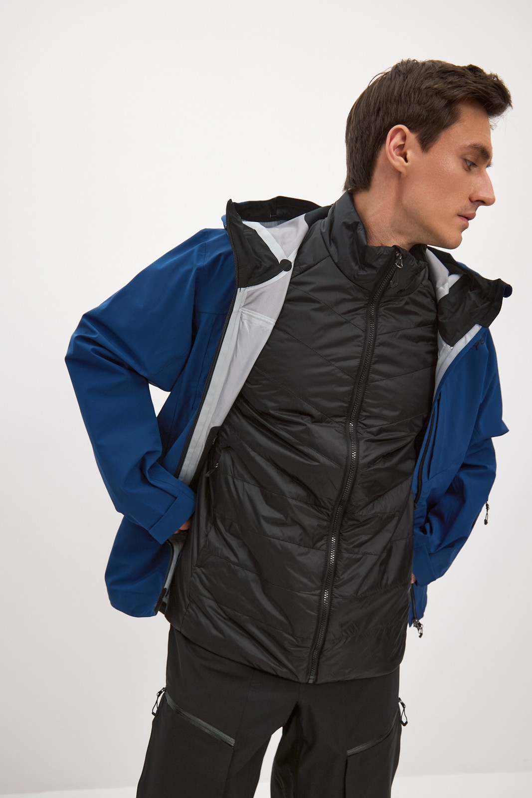 Мы интегрировали вентиляционные отверстия на молниях под рукава для быстрого отведения лишнего пара во время активного катания по пухляку и скитура. Центральная застежка – прорезиненная молния, с внутренней ветрозащитной планкой и клапаном для защиты подбородка от контакта с замком. Внутренняя поверхность ворота для комфорта отделана флисом.