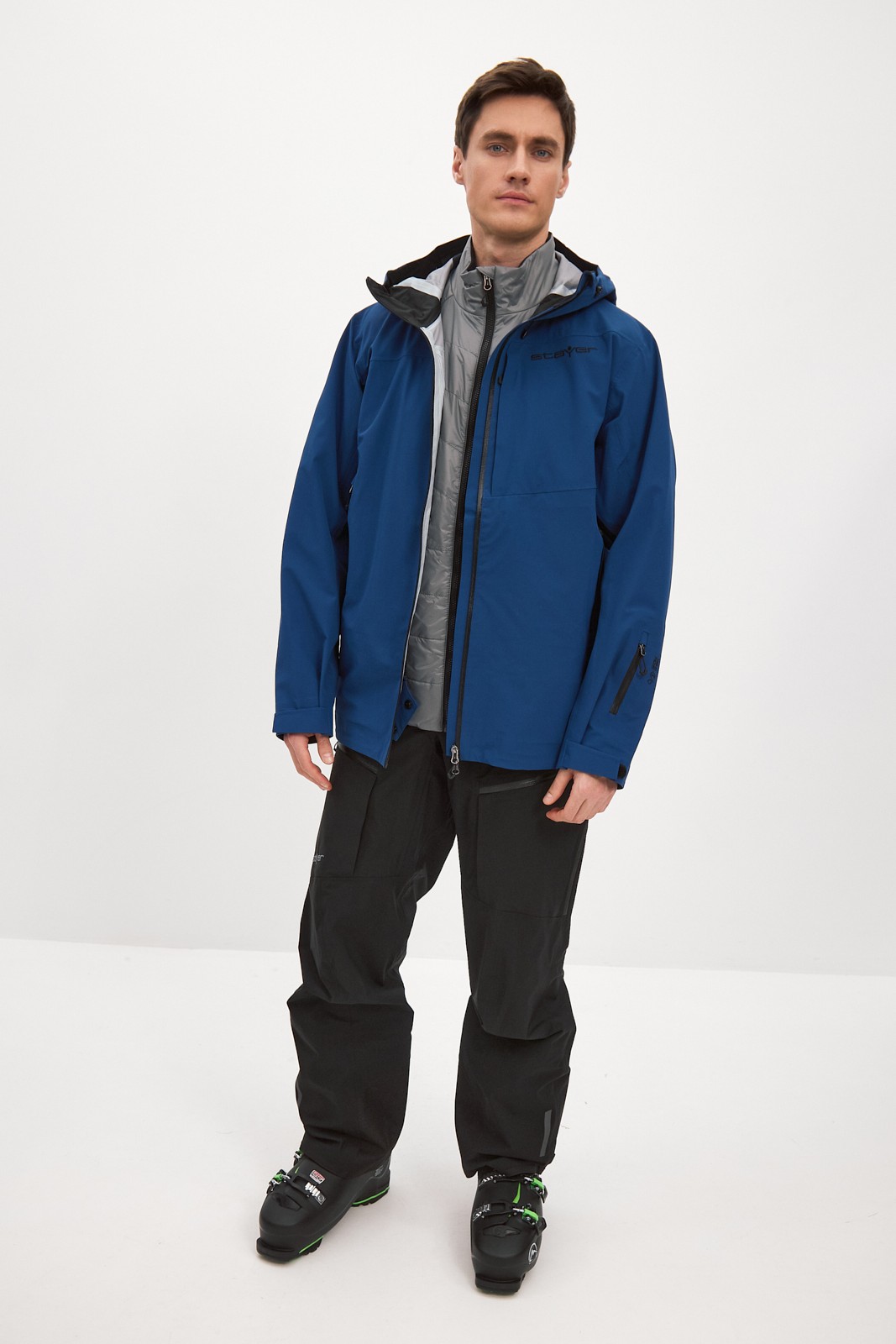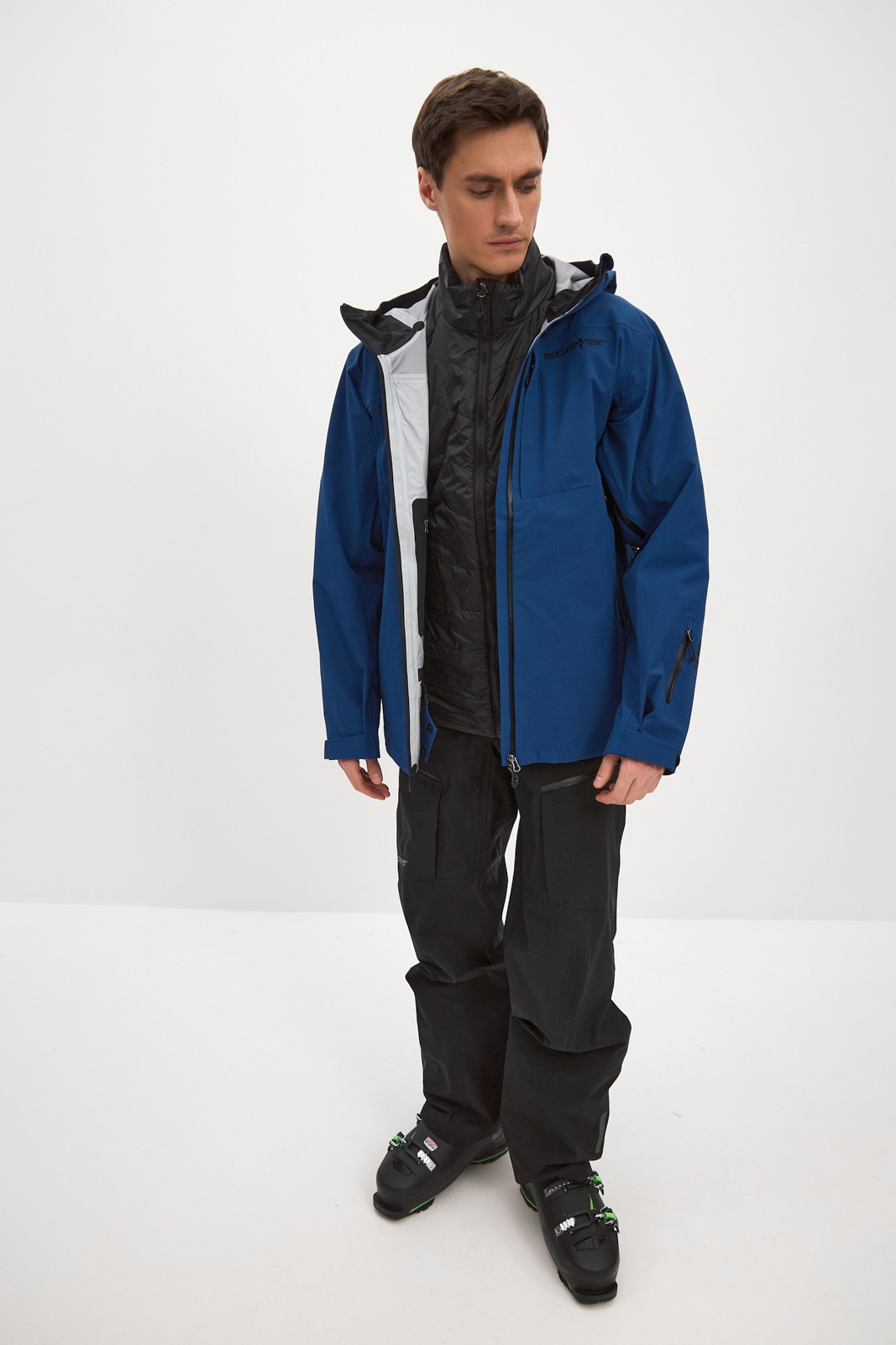 Снегозащитная юбка и регулировка по низу – для предотвращения попадания снега во время катания вне трасс. Высокий ворот и эргономичный регулируемый капюшон – для защиты от ветра и снега.