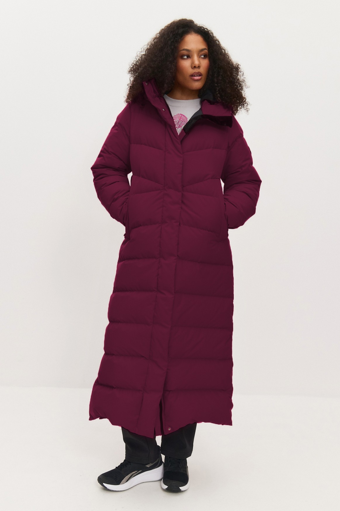 Длинный женский пуховик из полиэстера с мембраной, плотного переплетения c водоотталкивающей пропиткой.