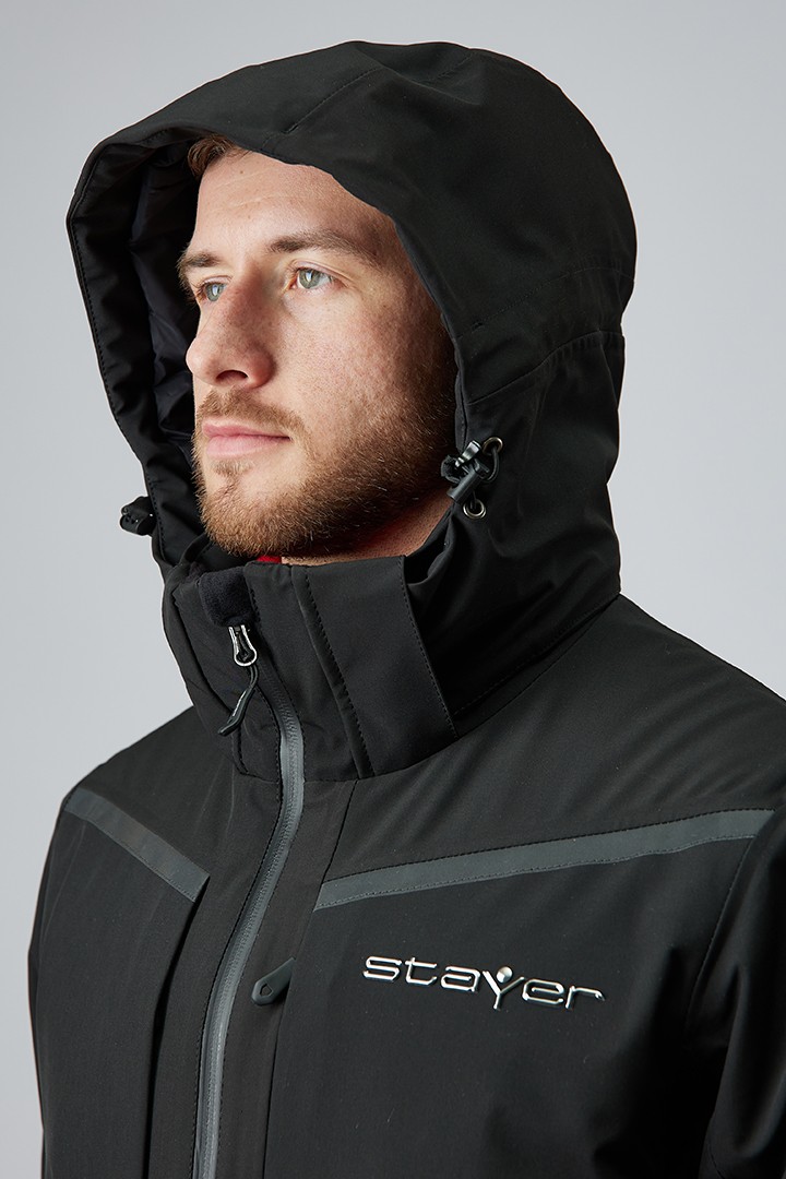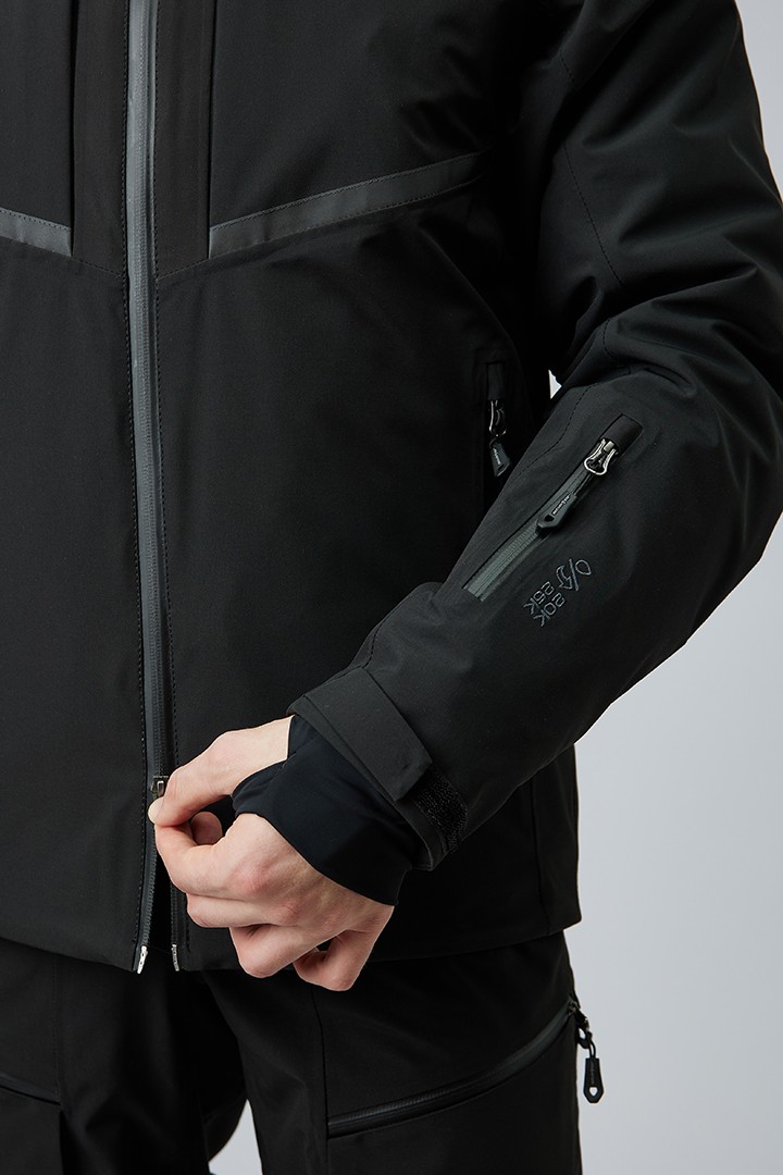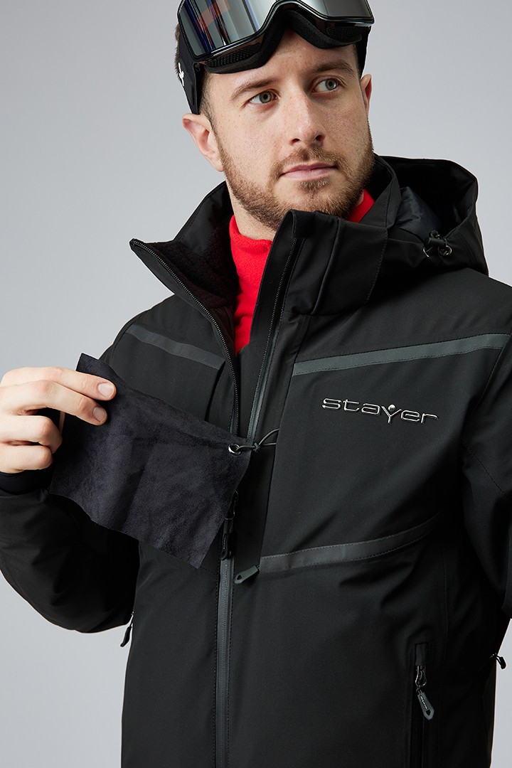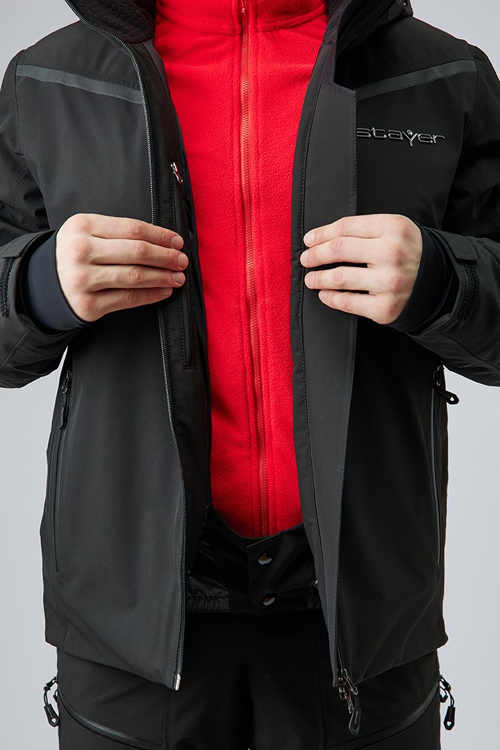 Для самых горячих лыжников мы интегрировали вентиляционные отверстия на молниях под рукава. Съёмный капюшон – для любителей скоростных спусков и максимальной аэродинамики. Центральная застежка – прорезиненная молния, с внутренней ветрозащитной планкой и клапаном для защиты подбородка от контакта с замком. Внутренняя поверхность ворота для комфорта отделана флисом. Манжеты регулируются липучками и дополнены встроенными полуперчатками с отверстиями для больших пальцев. Снежная юбка застёгивается на кнопки и защищает от попадания снега внутрь.